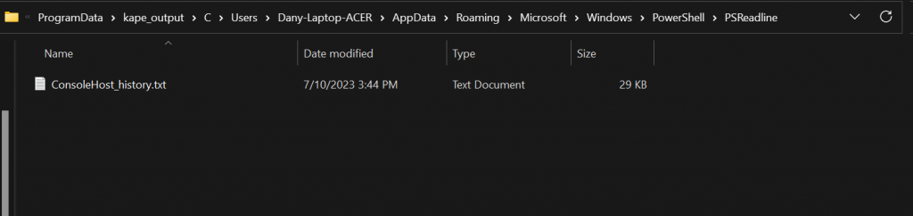 Using KAPE to collect the target is straightforward. In the example below Kape will search –tsource which is the whole C: drive for the specified –target PowerShellConsole history file: