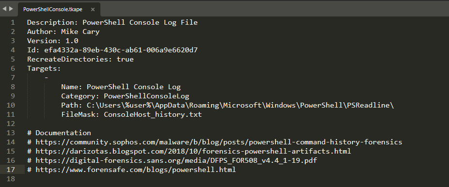 Above is the .tkape file for the PowerShell console log which sits in C:\Users\%user%\AppData\Roaming\Microsoft\Windows\PowerShell\PSReadLine and the target file is called ConsoleHost_history.txt.