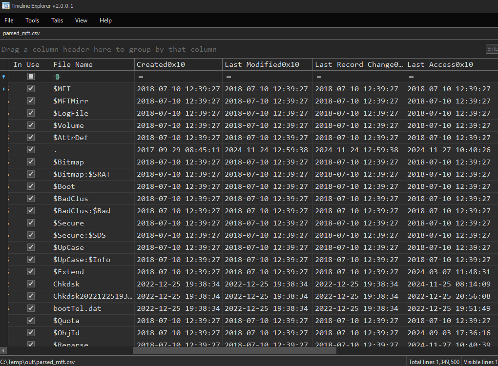 MFTECmd.exe -f "C:\Temp`$MFT" --csv "c:\temp\out" --csvf parsed_mft.csv